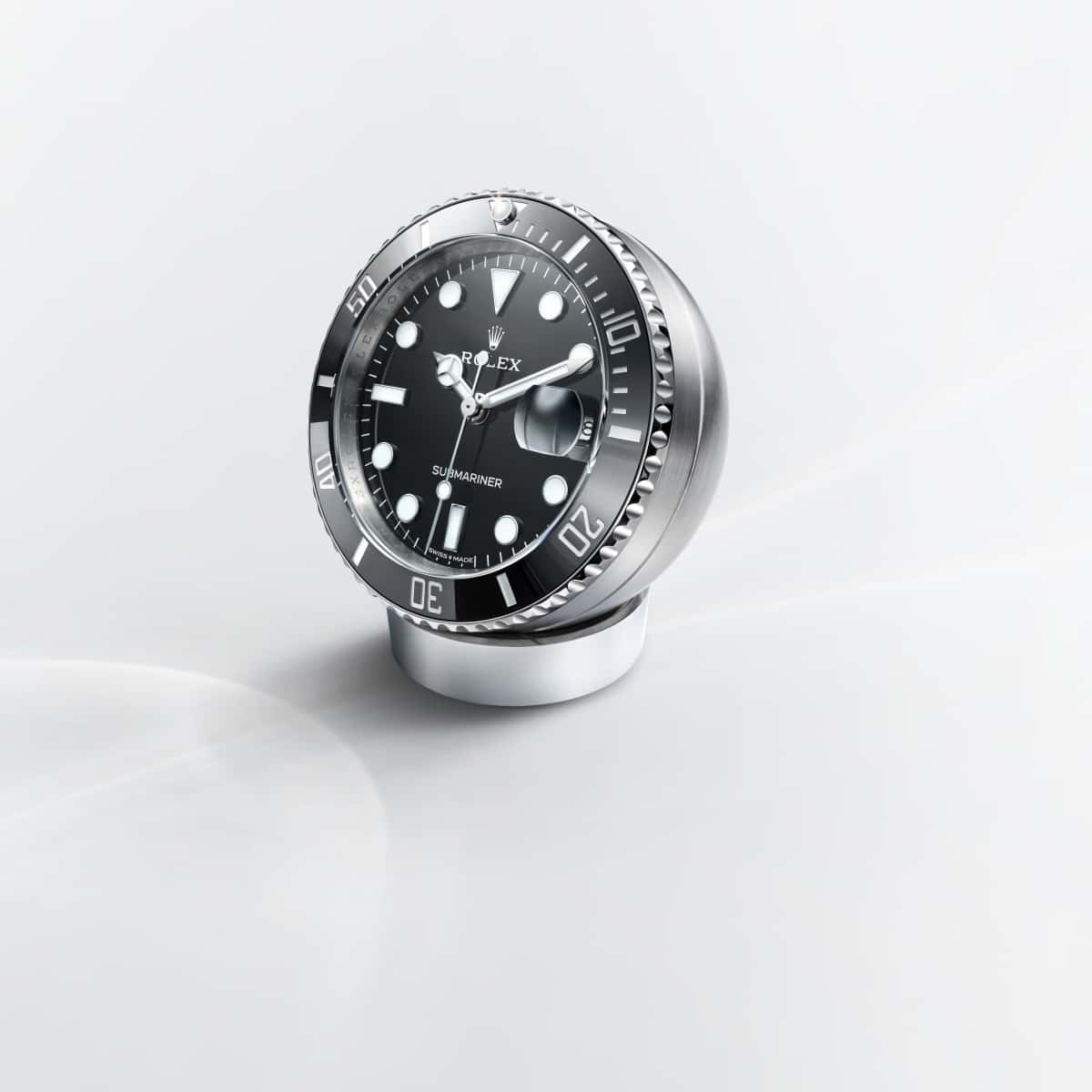 Cerachrom çerçeve diskli ve Chromalight göstergeli bu paslanmaz çelik Submariner masa saati, seküler bir takvimle donatılmıştır.